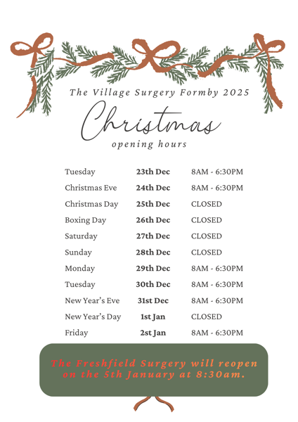 As follows are the opening times for the Surgery this Holiday season 2025.